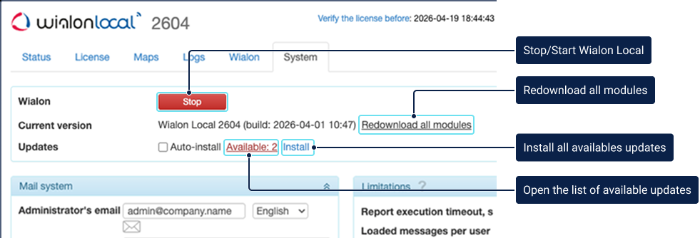 In this section, you can manually start and stop Wialon Local and install updates.