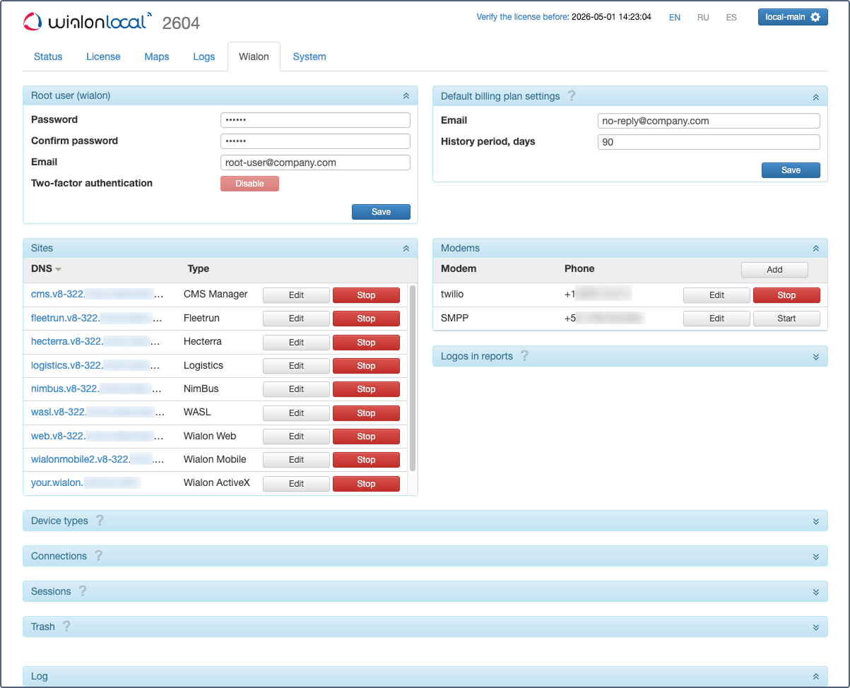 This page is accessible only when Wialon Local is operating. Here you configure sites and modems, manage recycle bin, etc.