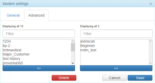 - On the Wialon tab in the Modems section, click Add at the top of the section.