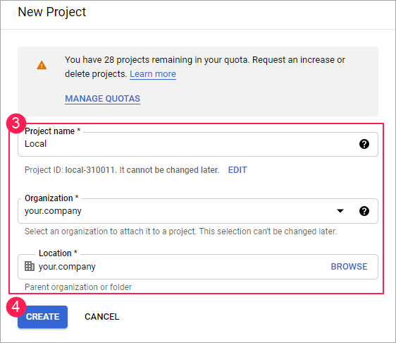 Specify the project name, organization, and the project location. If you use a personal account, the Organization field is not displayed.