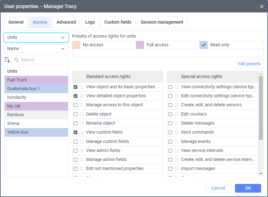 Access rights to a unit allow the user to see the location of this unit on the map, track its indicators (speed, altitude, sensor values, and so on), send commands and messages to it, use the unit in reports, notifications, jobs, and perform other actions with it.