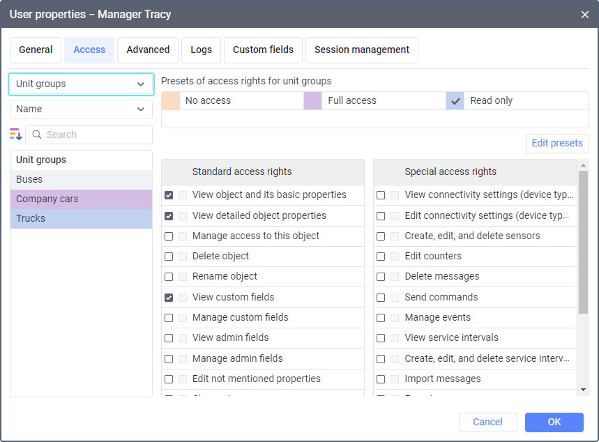 Manage custom fields | Allows creating, deleting, changing general custom fields in the properties of the group and its units. Also, allows editing the content of the Profile tab in the unit properties. This access right works only in combination with the previous one. |
