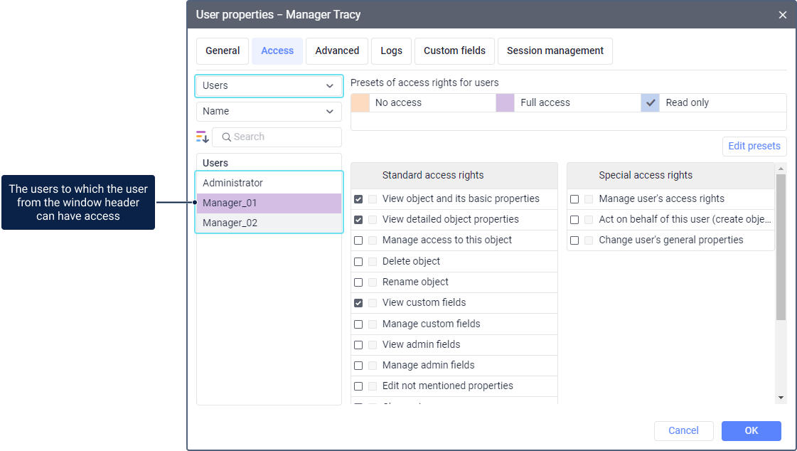 Manage access to this object | Allows seeing the user on the Access tab of the properties of other users, where you can configure access to this user. When transferring access rights, take the hierarchy rules into account. |
