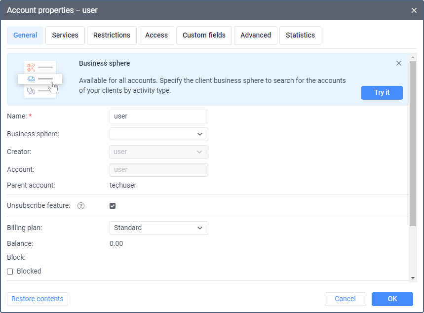 Account properties open when you click on the name of an account in the list. This window can display up to seven tabs, depending on your access rights to the account. It also contains the Restore contents button which allows you to restore the micro objects belonging to the account resource.