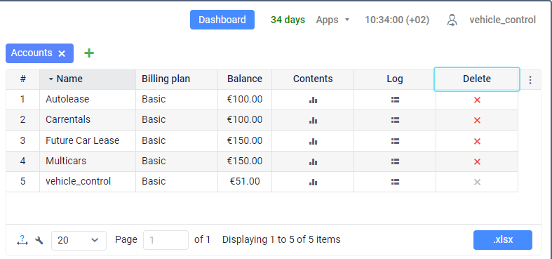 To delete an account, click on the icon