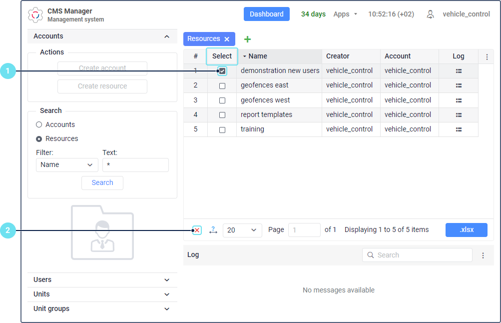 - all macro-objects belonging to the account (subordinate accounts, resources, users, units and groups of units, retranslators, routes).