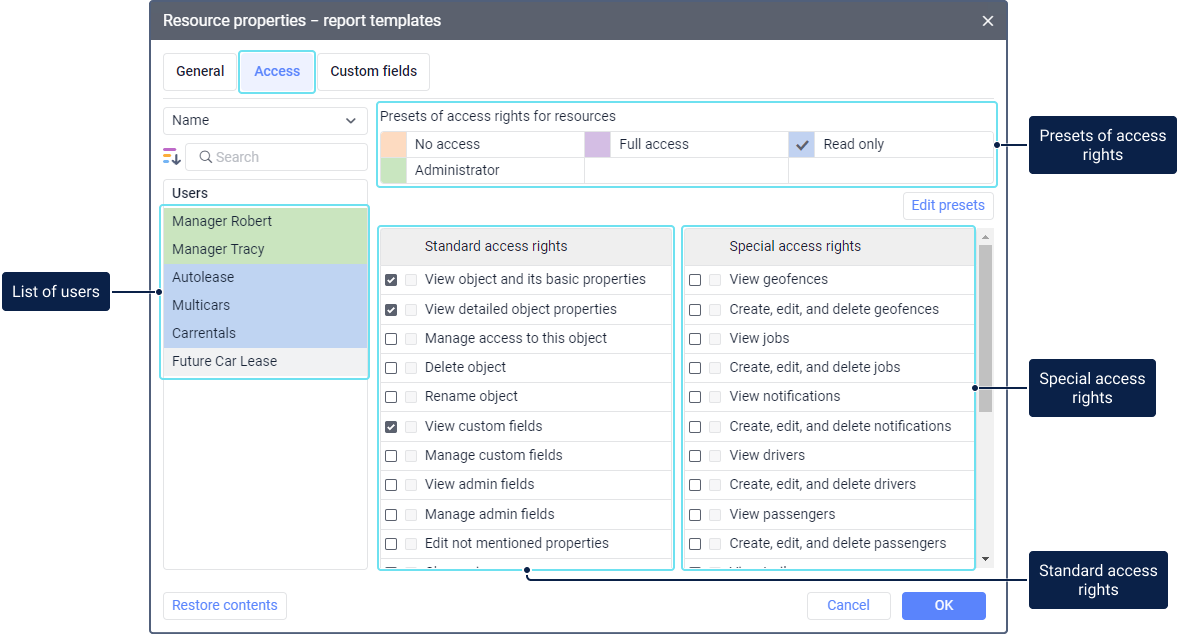 In the left part of the window, you can see the list of users to whom you can grant access rights to the resource. The names of users who have certain rights are highlighted in color.