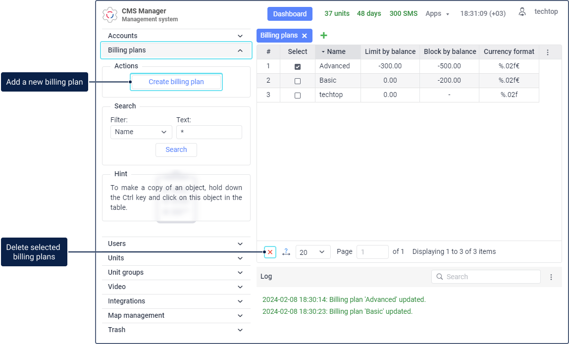 To work with billing plans, go to the Billing plans section in the navigation panel of CMS Manager. Here you can create, edit, and delete billing plans as well as search for them by name.