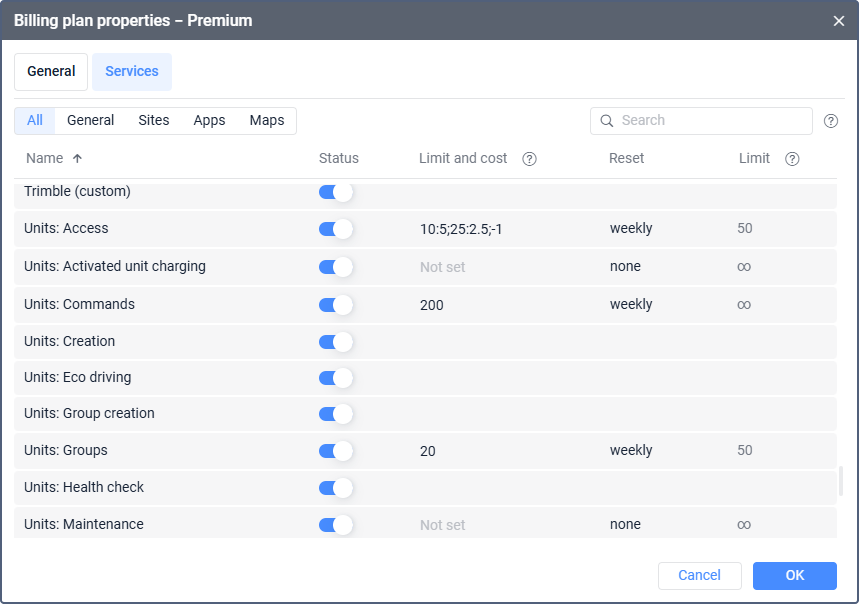The group includes general Wialon functionality, such as Eco Driving, Management system (CMS Manager), Units and others. Here you can enable or disable the service, configure the Limit and cost setting and select the reset period.