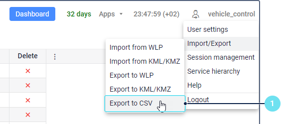 - In the user menu, select the Import/Export item and click Export to CSV.