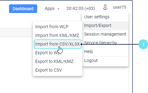 - In the user menu, select Import/Export and then select Import from CSV/XLSX.