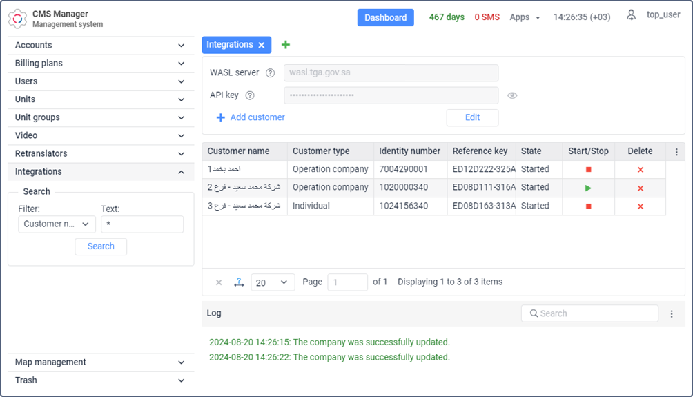Here you can configure transmitting data from Wialon to the Wasl platform. This feature is available only to the top users and users with dealer rights for whom the Integrations: Wasl Tracking Service as well as the Wasl and Drivers modules are activated. Besides, the Store registration time option should be enabled on the System tab in the administration system.