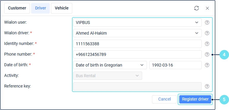 Field Description Wialon user Select your customer’s Wialon account. Wialon driver Select the required driver from the list of drivers created in your customer’s Wialon account. If the list is empty, no drivers have been created in the customer’s account. You can’t select a driver who has already been registered. Identity number Specify the driver’s ID indicated on the driver’s licence. It consists of 10 digits. Phone number Enter the mobile phone number of the driver. It should contain at least 10 digits. The plus sign is added automatically before the number. Date of birth Select the type of calendar (Gregorian or Hijri) and specify the driver’s date of birth. Activity The activity type specified when registering the customer. Displayed only if the activity type is not default. This field is not editable. Reference key The driver’s reference key. This field is filled in automatically after registering the driver. -