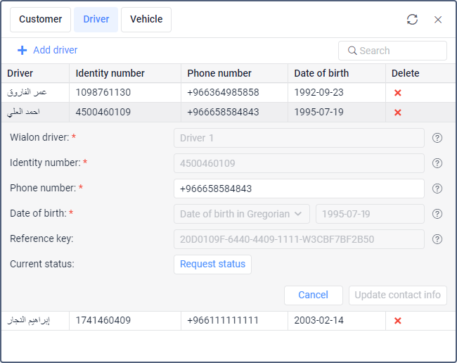 Click on the driver row to expand it and see the information about the driver, including the reference key, request the current status, or edit the phone number.