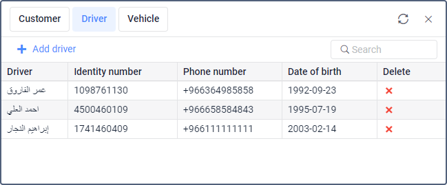 To quickly find a specific driver, use the dynamic search above the table. This feature allows you to search for drivers by name, identity number, phone, and date of birth.