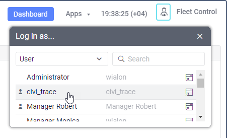 You can log in to the management system on behalf of other (subordinate) users. To do this, you should have the Act on behalf of this user access right to them.