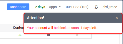 - number of days left until the account is blocked (shown if the Block by days option is enabled; not displayed for the users of top accounts);