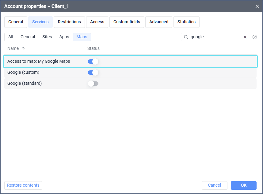 When adding a map, you should specify the name of the service with which you can control access to the map and its services. Thus, the top account user can enable or disable this service in the properties of the required billing plans or subordinate accounts.