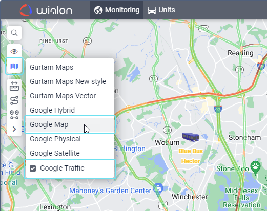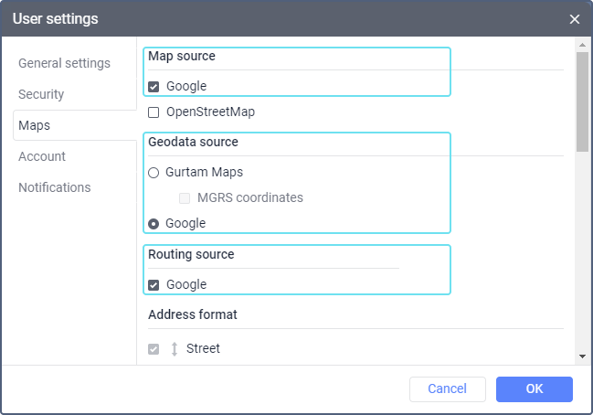 In the monitoring system user settings, select the added map. Depending on the types of services selected in step 6, it may be available under Map Source, Geodata Source, Routing Source.