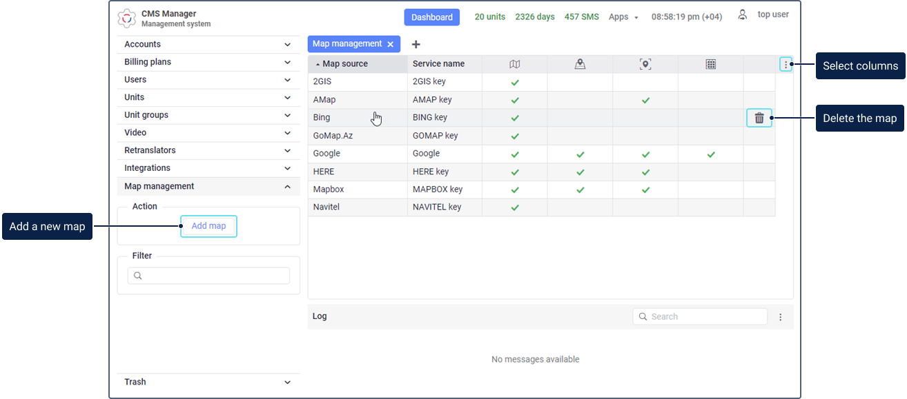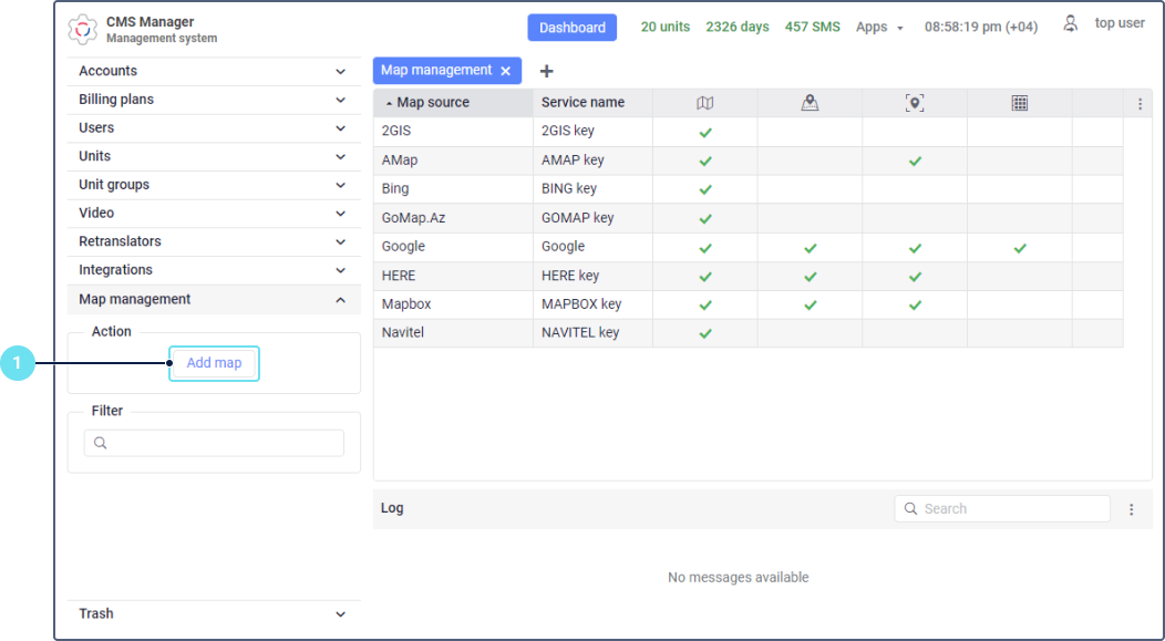 The Map management section is available only in the CMS Manager and for top accounts. In this section, you can add, edit, and delete maps. A standard table contains all the added maps that can be used as basemap, routing source, geodata source, and distance matrix. The available services of the map are marked with the icon