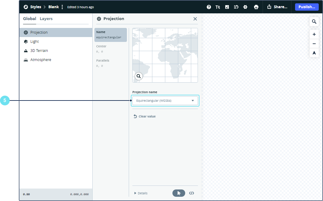 In the Projection section of the Globe tab, select the Equirectangular (WGS84) projection.