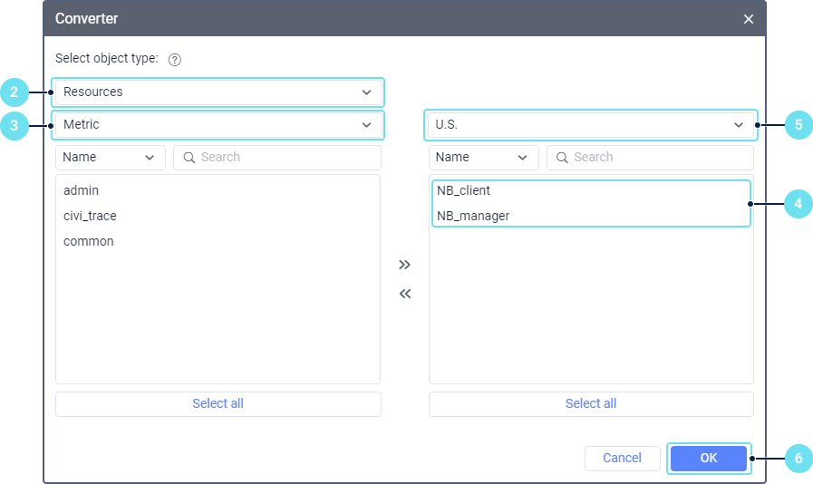 - In the drop-down list, select the object type for which you want to carry out the conversion: units, resources, users, or routes. Read more about the conversion particularities of these objects below.