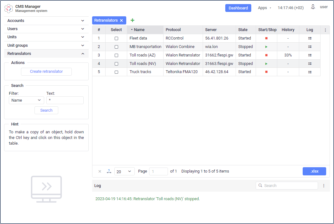 Retranslators allow transmitting unit messages from your server to other servers or systems in real time or for a past period. With retranslators, data can be transmitted simultaneously to several servers using different protocols.
