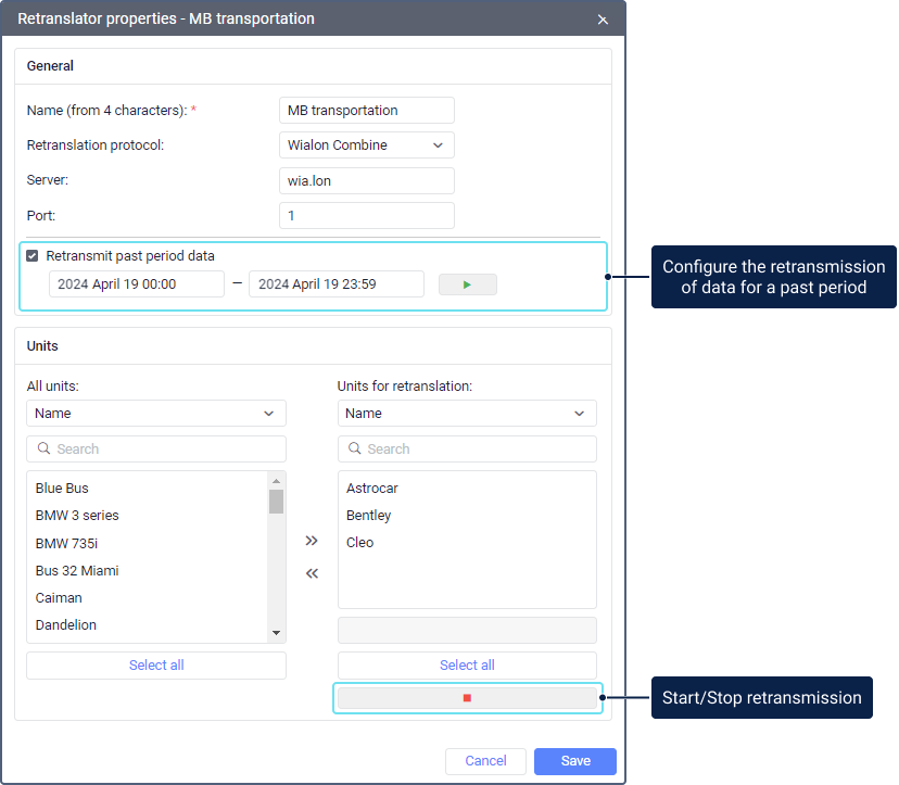 Unit messages are transmitted only when the retranslator is started. By default, data is transmitted in real time. If transmission has been suspended, the messages accumulated during this time are not transmitted. To transmit them, use the Retransmit past period data option.