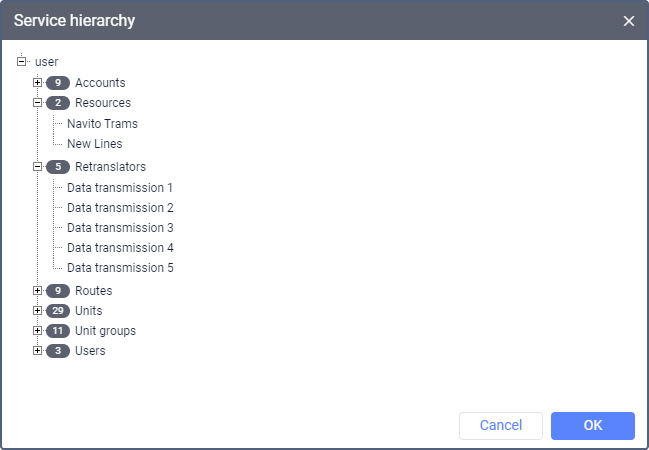 The service hierarchy is shown as a list, each item of which is a type of macro objects subordinate to your account. Next to each item, you can see the number of macro objects of this type. Click on the item to expand or collapse their list.