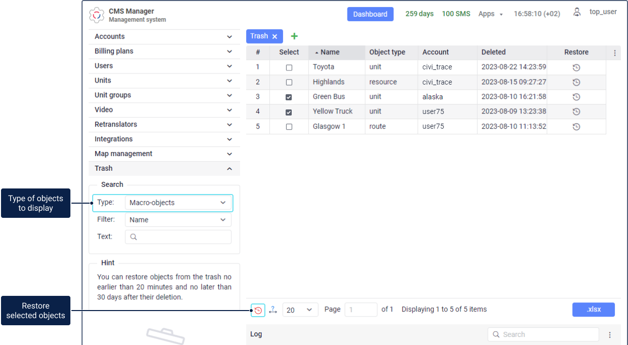 Depending on the object type selected in the Search section, the trash contains the deleted micro- or macro-objects of the system. In the case of micro-objects, only drivers, trailers, and passengers are shown here.