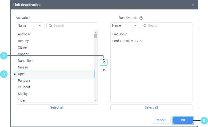To activate a unit, follow steps 1–5 for the deactivation, but in step 3, select the unit in the right list, and move it to the left one using the icon