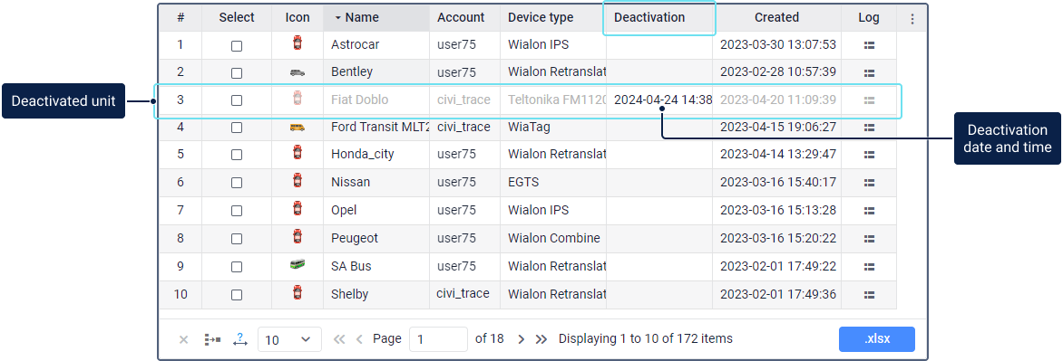 While a unit is deactivated, the system doesn’t accept new data (messages) from it. However, its data received before deactivation is stored during the history period set for the account.