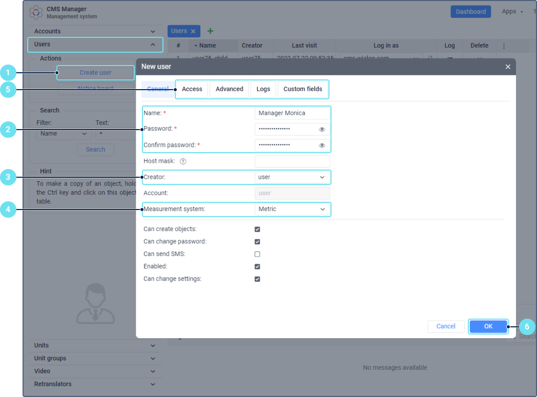 - manually using the Create user button (the Users section in the management system) or the Create button (the Users tab in the monitoring system).