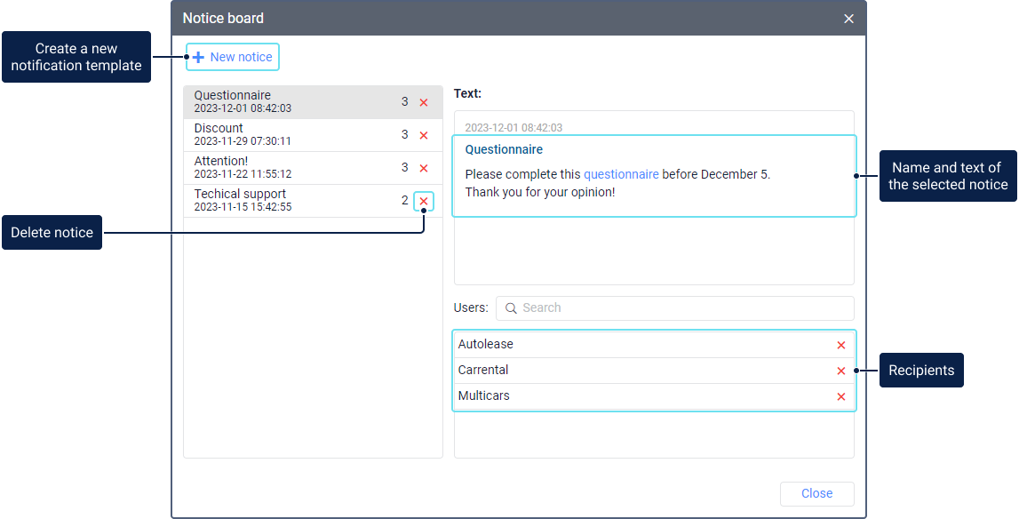 To see the notice text, click on its line in the list. Below the field with the text, you can see the list of all users specified as the recipients of the notice. To quickly search for them, use the dynamic filter.