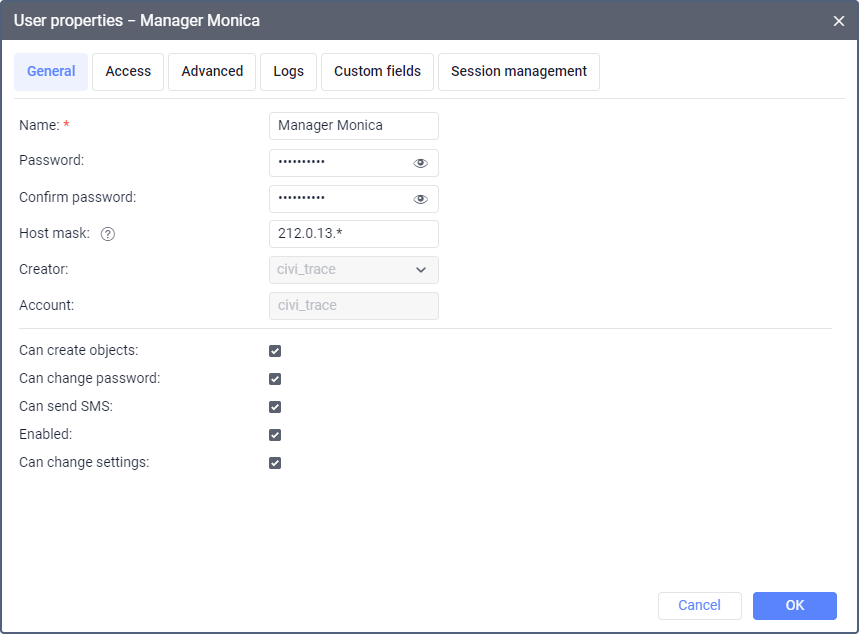 | Host mask | The mask of the IP address of the device from which the user can log in to the system (maximum of 1024 characters). For example, a mask may be required when logging in to the system should be available only from the user’s work computer. When specifying a mask, you can use an asterisk * which replaces any number of unknown characters. Example of a mask: 212.0.13.*. You can specify the required number of masks separated by commas without spaces.If this field is not filled in, the user can log in to the system from any IP addresses. |