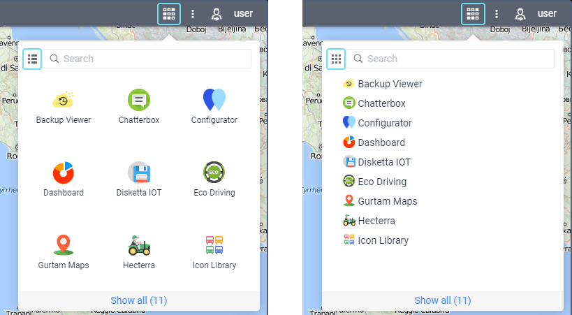 To open the Apps menu, choose the corresponding icon in the top panel or click the necessary item in the main menu customizer.