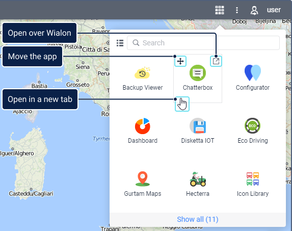 An application can be opened either in a new tab of the browser or in a separate window over Wialon. To open an application in a new tab, click its logo (name). In order to open it over Wialon, use the button