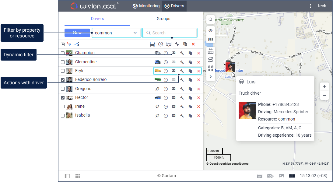 In a driver tooltip, you can see the driver name, description, enlarged photo, phone number, custom fields (if specified), the name of the unit to which the driver is assigned, and the resource to which the driver belongs.