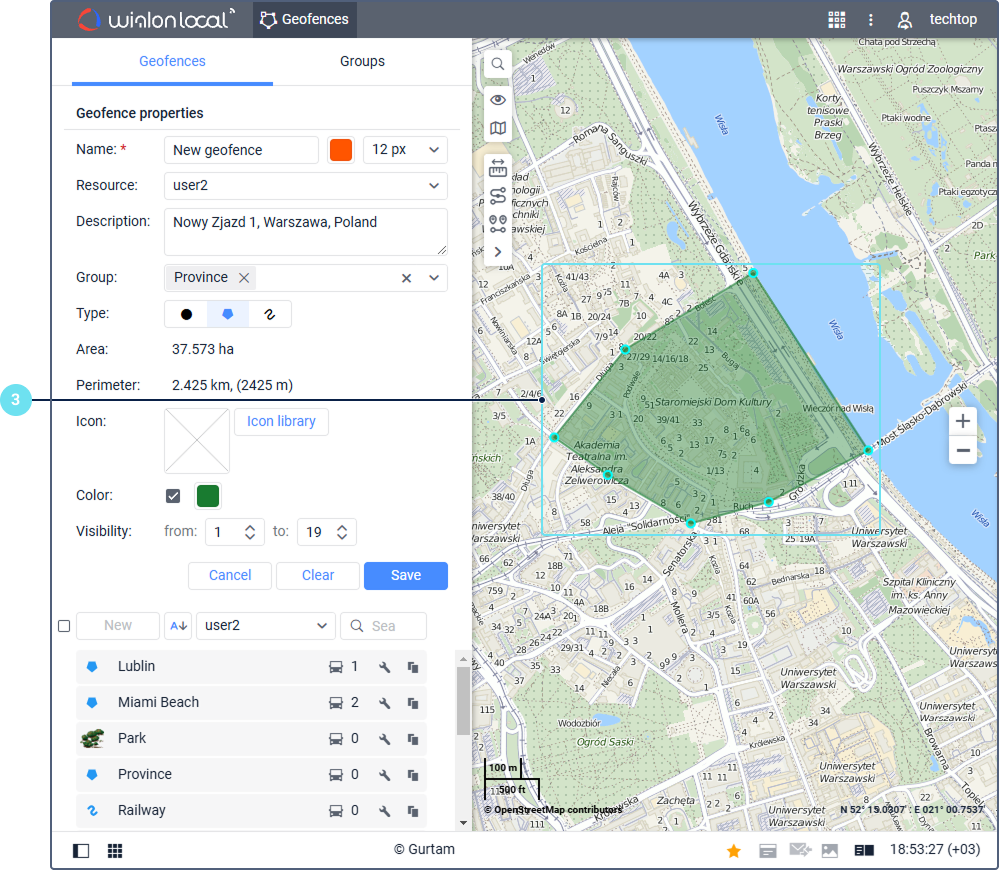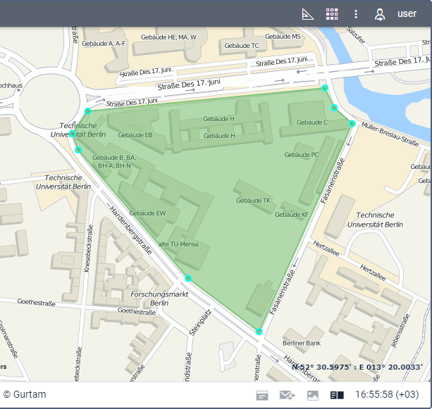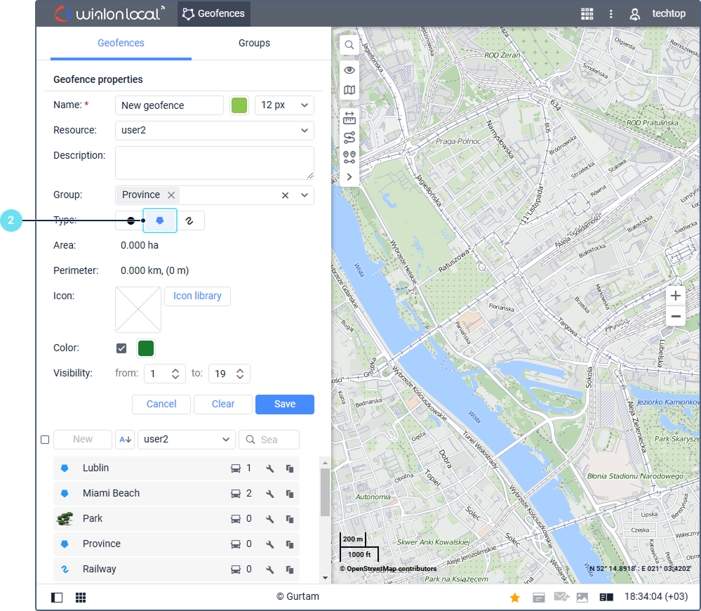 To delete a point, double-click on it. This action is only available for polygons and lines. However, if the polygon consists of three points and the line consists of two points, you cannot delete these points. You can move them or delete the geofence by clicking Clear in the work area.