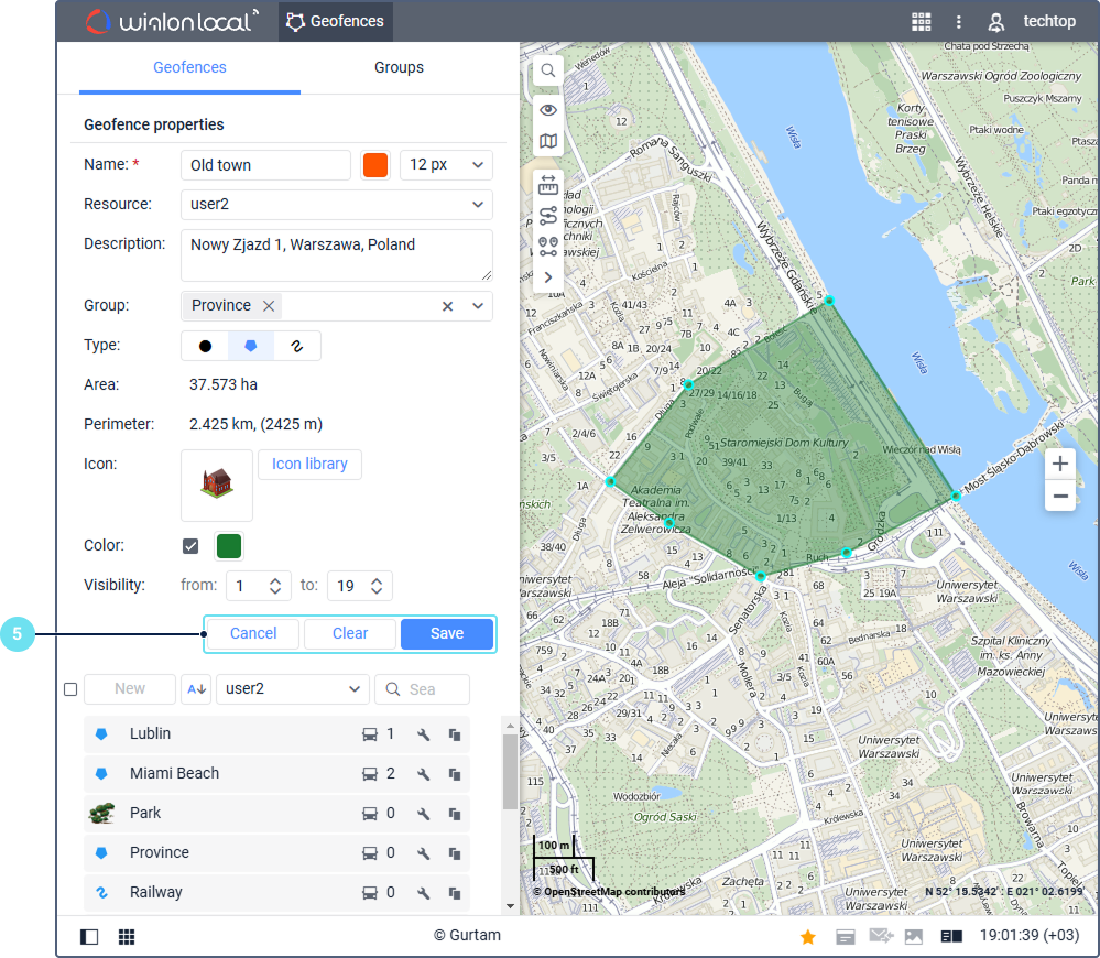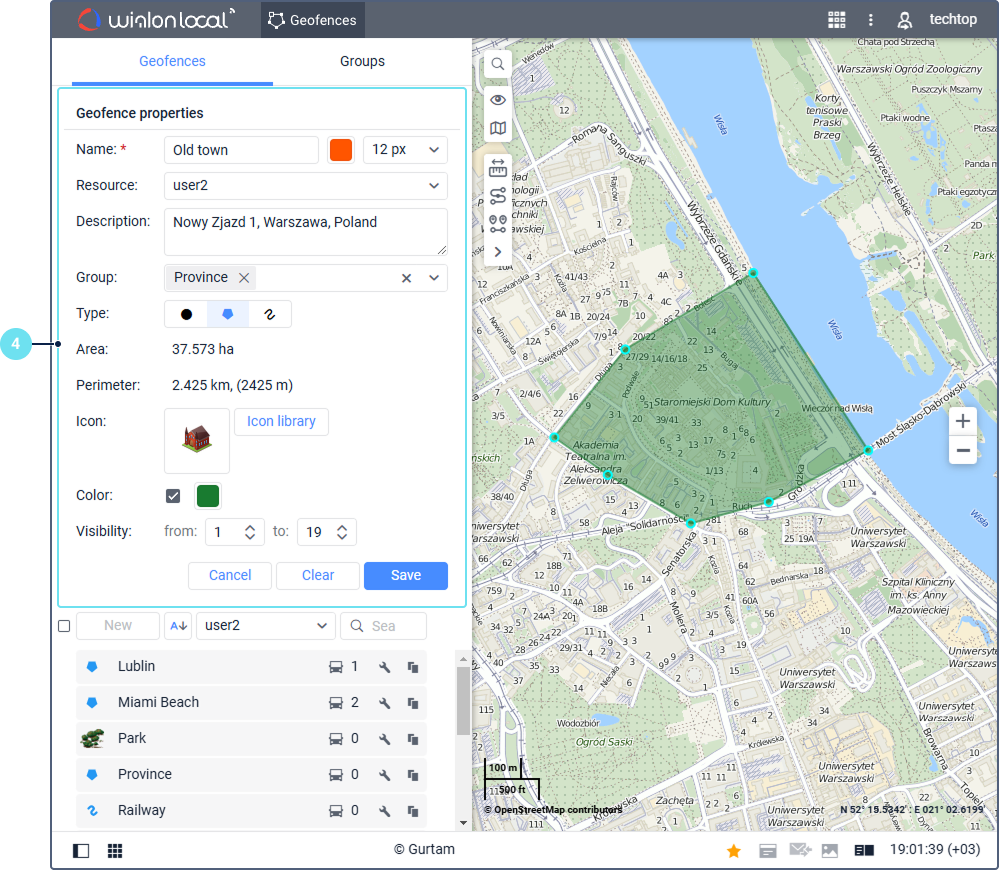 After clearing the properties of the geofence of the Line type, the default length of 50 m is applied. For the geofence of the Circle type, the default radius of 100 m is applied.