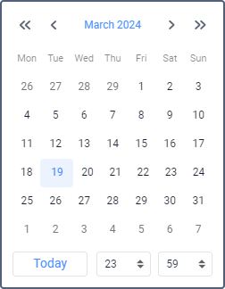 There are several methods to work with the calendar and quickly set up a desired date and time: manual input, using buttons or the mouse scroll, etc.