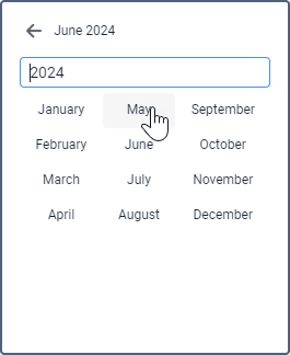 Open the calendar by pointing to the date and time input field and pressing the left mouse button. Use the arrows to select the year and month. To change these values, you can either click on these buttons or use the mouse scroll. Single arrows are used to select the month, double — to select the year. After moving to the required month and year, click on the date below with the left mouse button. This closes the calendar, and the date you selected appears in the text box.