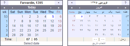 The Persian calendar can be activated in the user settings. If Persian (Farsi) is selected as the interface language, the calendar is also in Persian and is shown from right to left. In other cases, it is in English (in Latin characters and Arabic numbers) and shown from left to right.
