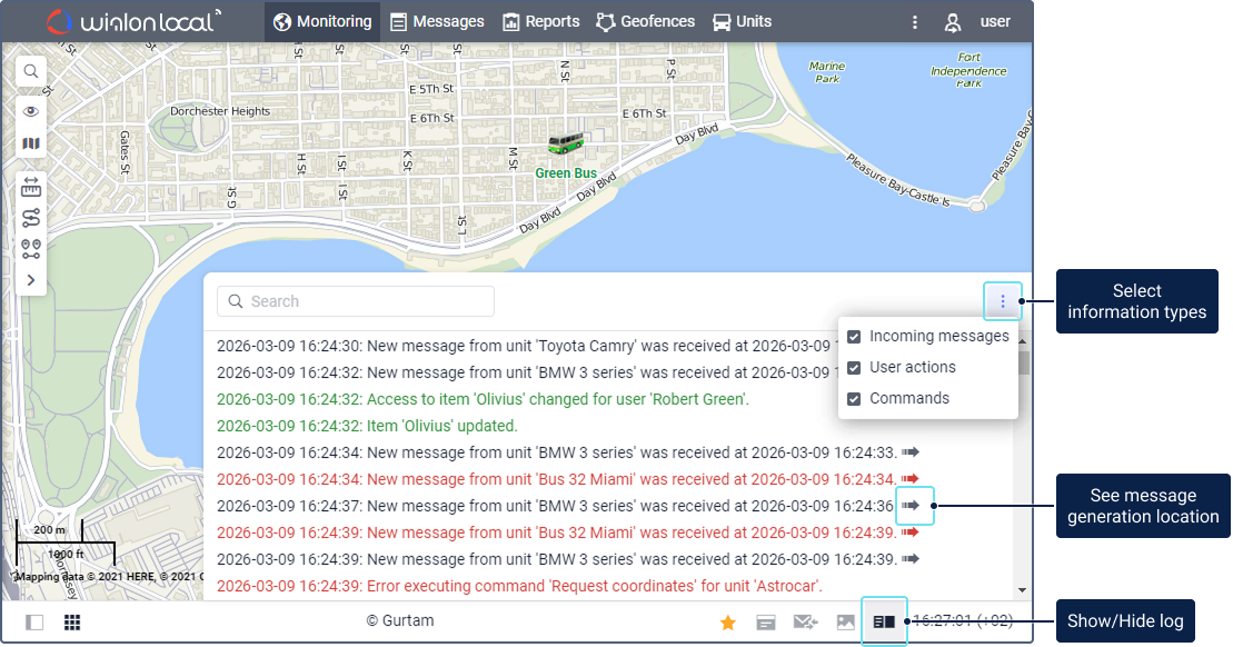 The log shows real-time information about the reception of unit messages, sent and executed commands as well as about user actions.