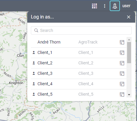 - In the list that opens, click on the row of the required user to log in as this user in the current tab. To do this in a new window, click the icon