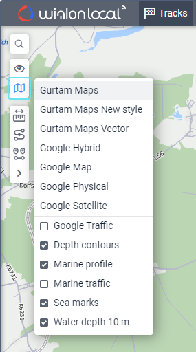 The available base layers depend on the map sources selected in the user settings. There you can also save the current position of the map for further logins. If the option to select any map source is not available, contact your tracking system administrator.