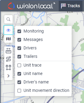Such tabs as Monitoring, Tracks, Messages, Reports, Geofences, Routes, Drivers, Trailers and Passengers can have their layers on the map. Graphic elements applied to a map when working on a particular tab can be easily switched on and off. Displaying or hiding the graphic information on the map is adjusted for each layer individually in the layers menu, which can be opened by clicking on the Eye icon in the upper left corner of the map. Here you can read more about the work area.