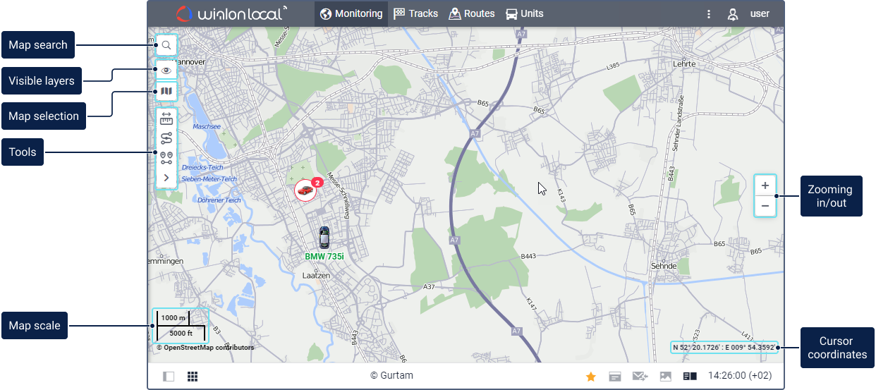 In the lower left corner of the map, the current scale of the map is indicated. In the lower right corner, you can see the geographical coordinates of the place the cursor points at. The coordinate format is selected on the Maps tab in the user settings and can be either degrees or degrees and minutes.