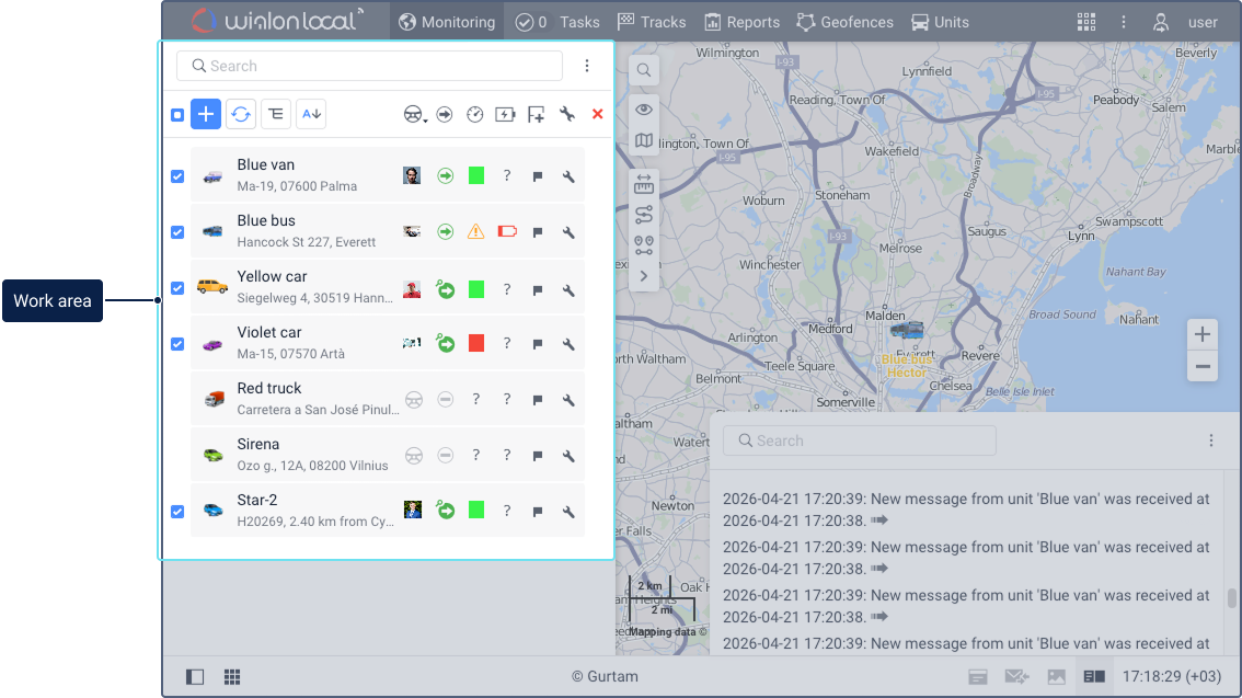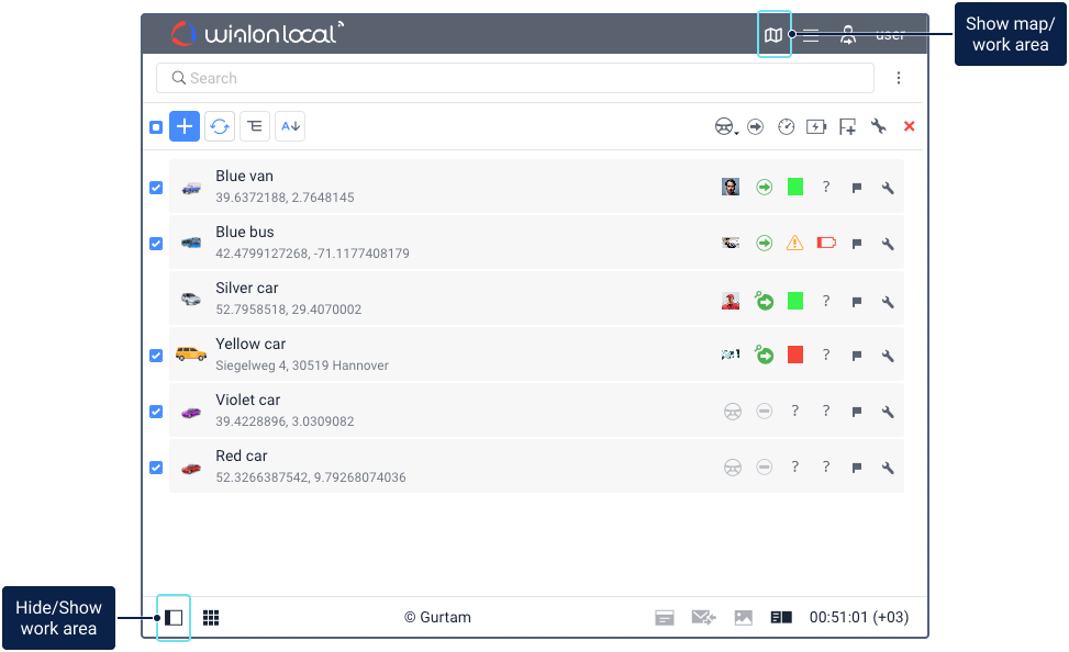 If the width of the screen doesn’t allow displaying the working area and the map at the same time, you can also use the icon in the top panel to switch between them. The appearance of the icon depends on the open tab.
