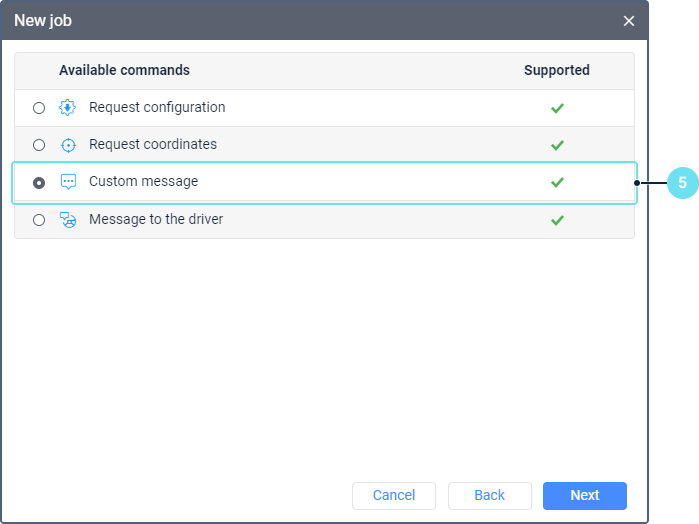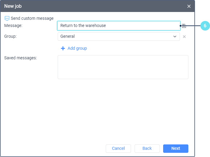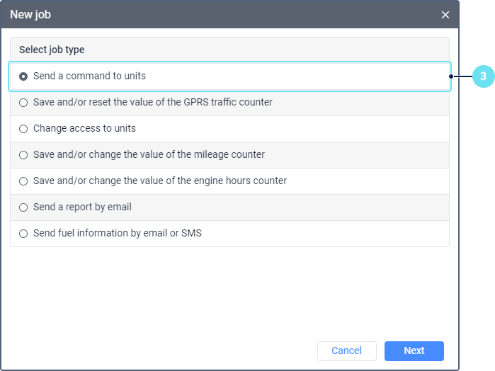 - Set the parameters which depend on the selected job type and are described in the Job types section. In the case of the Send a command to units job, this step goes after the unit selection.
